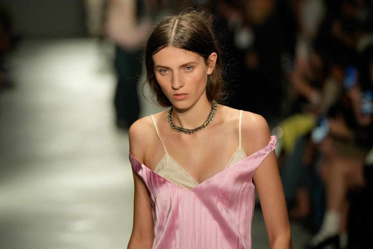 The lightness allowed Dell’Acqua to layer amply. Plaid kilts were underpinned by petticoat layers. Prairie skirts with a big hem ruffle were tied prettily at the waist. Silken slip dresses were worn one atop the other.