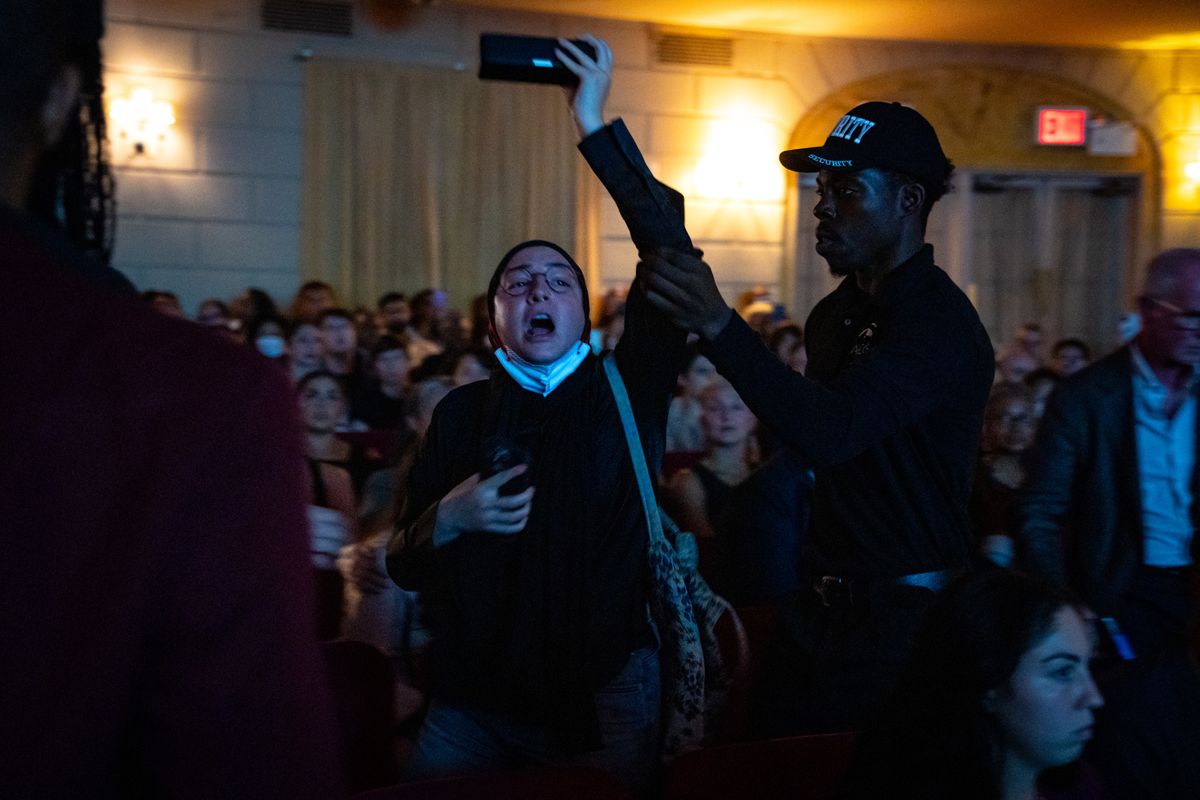 Outside the venue on Wednesday night, dozens of activists protested on the sidewalk. Inside, the event veered off script several minutes after it began when a protester started shouting from the audience.
