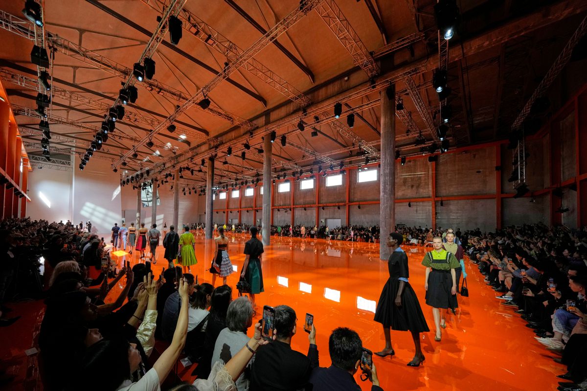 MILAN (AP) — Prada’s cavernous showroom was awash in bright orange paint Thursday for a women’s collection that swerved from cocooning to revealing, rigorous to feminine.