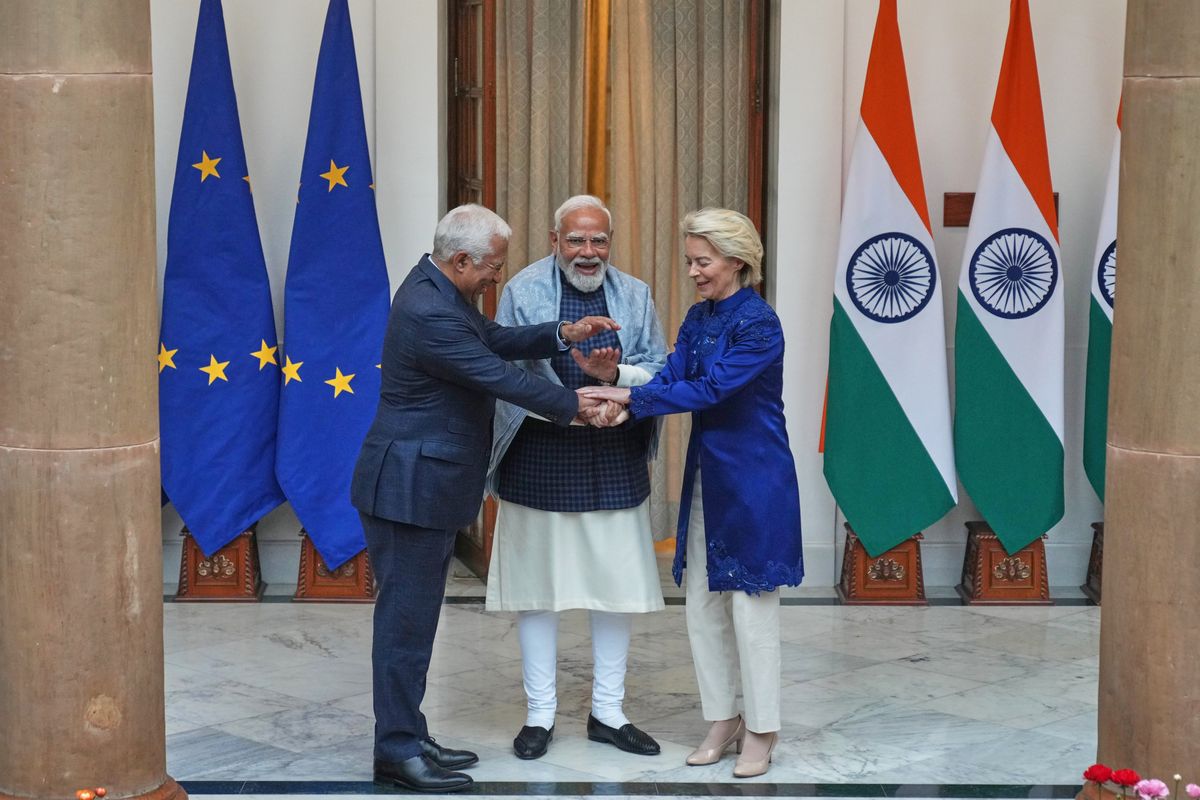 Speaking at a joint news conference in New Delhi with European Commission President Ursula von der Leyen and European Council President António Costa, the Indian leader said the partnership with the EU “will strengthen stability in the international system” at a time of ”turmoil in the global order.”