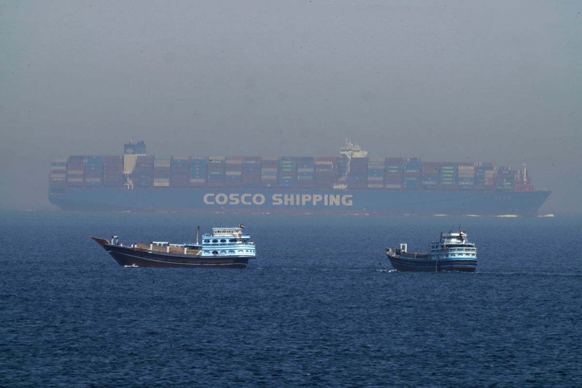 FILE - Two traditional dhows sail by a large container ship in the Strait of Hormuz, May 19, 2023. (AP Photo/Jon Gambrell, File)