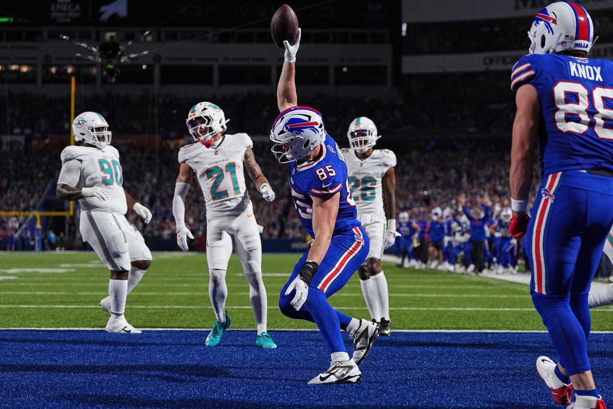 Buffalo’s Dalton Kincaid scored on a 20-yard catch, and rookie tight end Jackson Hawes scored his first career TD on a 5-yard pass that Allen released with a flick of the wrist while on the run.