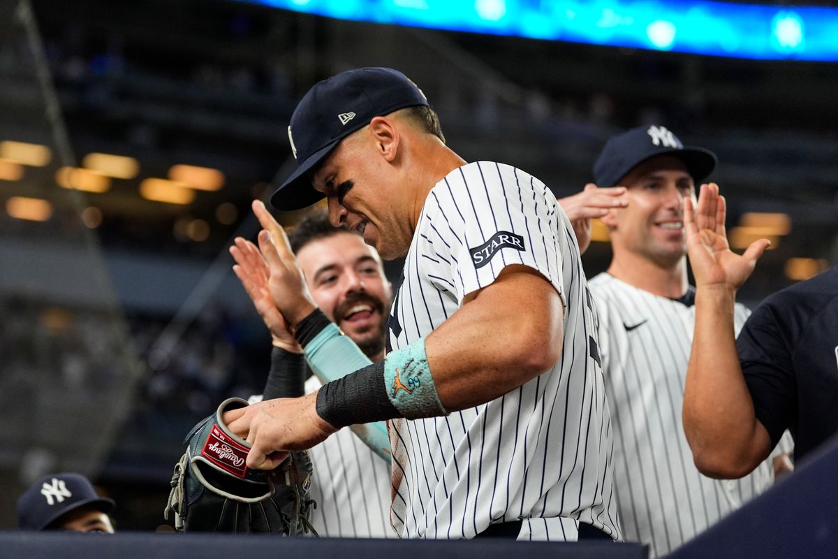 With runners at the corners, two outs in the eighth and a full count, Judge sprinted to deny Kyle Tucker of an extra-base hit, catching the ball just before the right-field foul line and sliding on his chest across the warning track. His pinstripes were soiled with dirt when he got up.