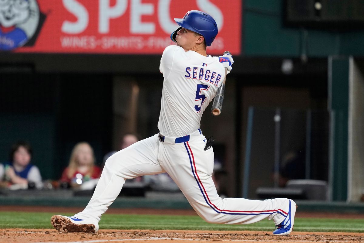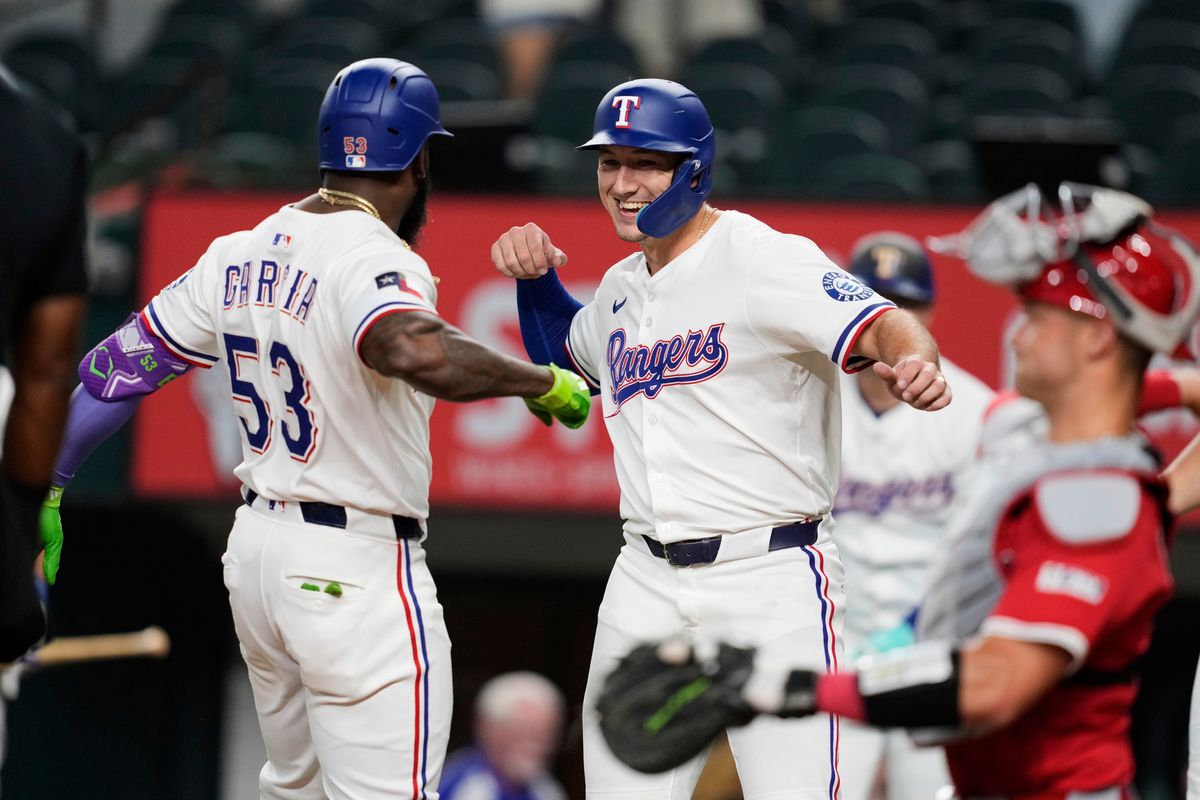 Wyatt Langford reached base all five times and scored four runs before he was replaced by a pinch-runner in the seventh.