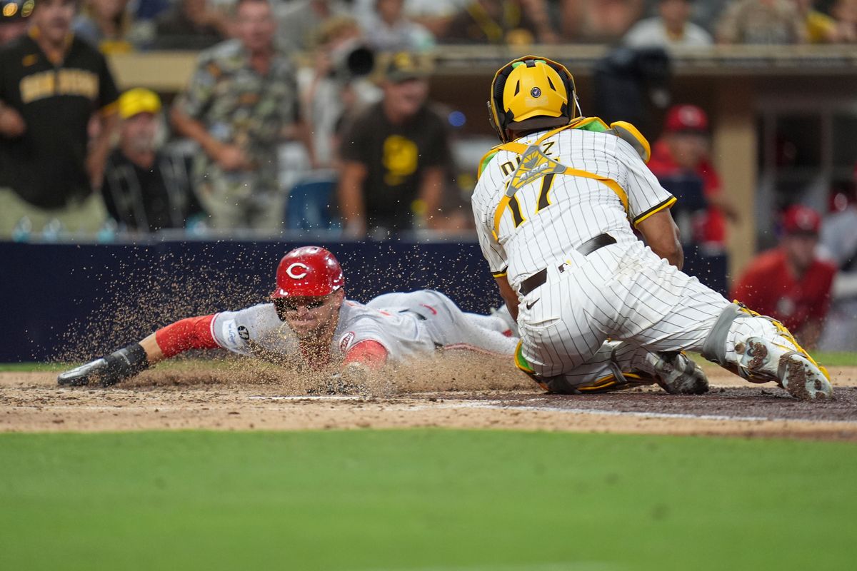 Hart allowed TJ Friedl’s one-out bunt single before Morejon came on with two outs and gave up De La Cruz’s single to right to bring in Friedl, who beat Tatis’ throw with a headfirst slide to score the tying run from second base.