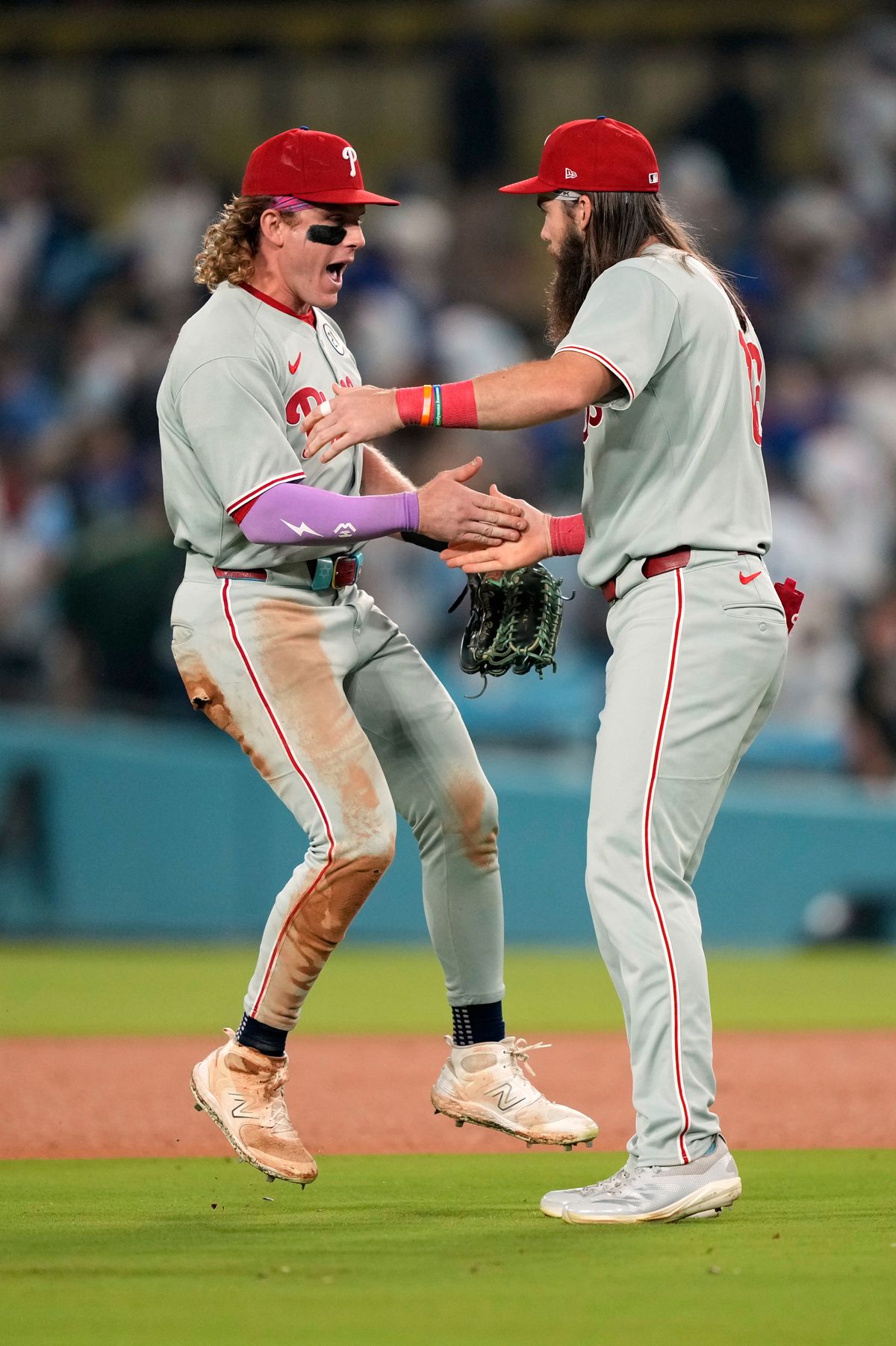 After the Dodgers’ Max Muncy grounded out to end it, the Phillies gathered near the mound to celebrate. They posed for a photo on the field as red-clad fans cheered behind their dugout at Dodger Stadium.