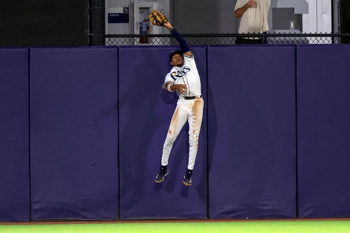 With the Rays leading 1-0 in the fourth, the Blue Jays had runners on second and third with none out when Kirk hit a fly ball to deep center at Steinbrenner Field. Simpson leaped and made the catch with his glove above the wall, turning a potential homer into a sacrifice fly.
