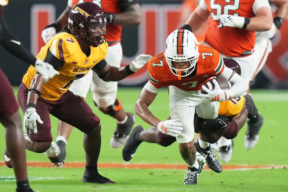 Miami lost linebacker Wesley Bissainthe on the first series of the game after he was flagged for a targeting penalty. Bethune-Cookman lost safety Jordan Johnson after a targeting call in the third quarter, meaning he will sit the first half of next week’s game at South Carolina State.