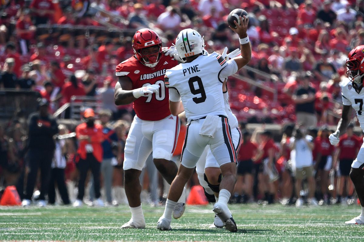 The Louisville defense picked off Falcons quarterback Drew Pyne twice inside the 50 in the first half as the hosts led 21-3 at halftime. Pyne finished 12-of-22 passing for 131 yards and a fourth-quarter score.
