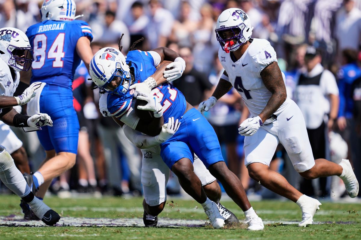 There was another impressive catch by McAlister inside the 1 and then stepping into the end zone that didn’t count, a leaping grab late in the third quarter while defended on a third-and-15 from the 30, though officials ruled his foot landed out of bounds. There was no replay review by the ACC officiating crew, even though Dykes called timeout before the Frogs missed a 47-yard field goal.