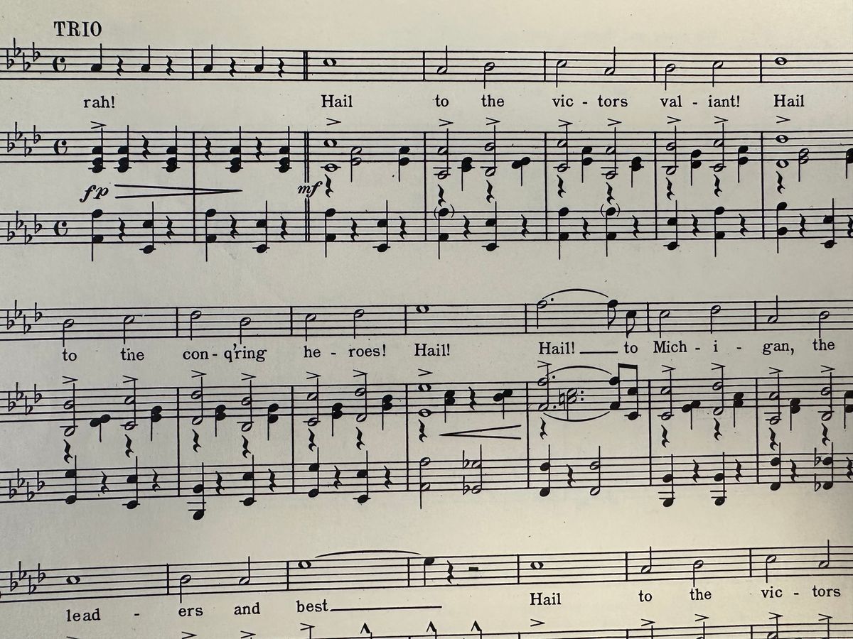 Michigan’s familiar fight song dates to 1898 when a music student at the school, Louis Elbel, wrote it following the Wolverines’ 12-11 win over the University of Chicago for their first Western Conference football title.