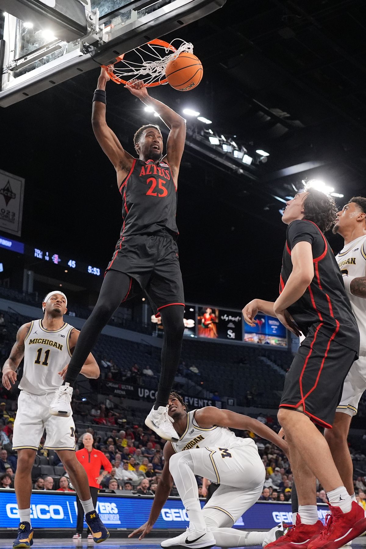 The Wolverines led by 17 points midway through the first half, but San Diego State cut it o nine with 1:26 left in the half on Harrington’s 3-pointer. Burnett countered with his own 3-pointer with 1:05 left and the Wolverines went into the half with a 45-33 lead.