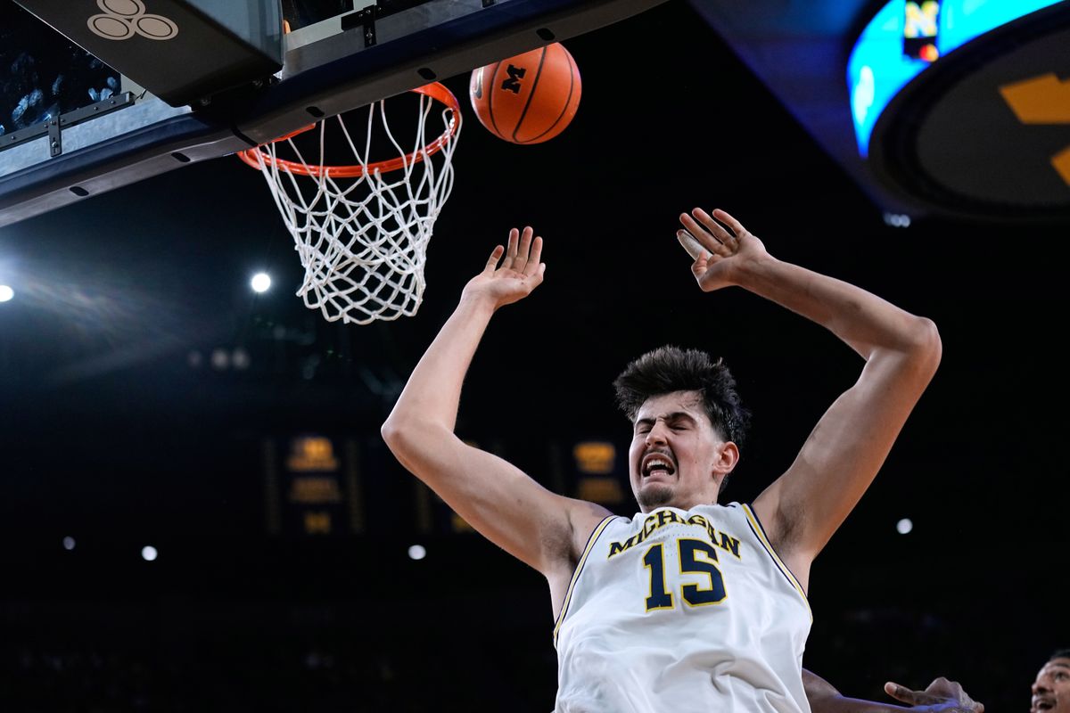 Michigan starting guard Nimari Burnett was helped from the court with 16:25 left after falling during a battle under the basket. He went down to the floor and appeared to be bleeding above his eyebrow and holding his ankle. He sat on the bench the rest of the night.