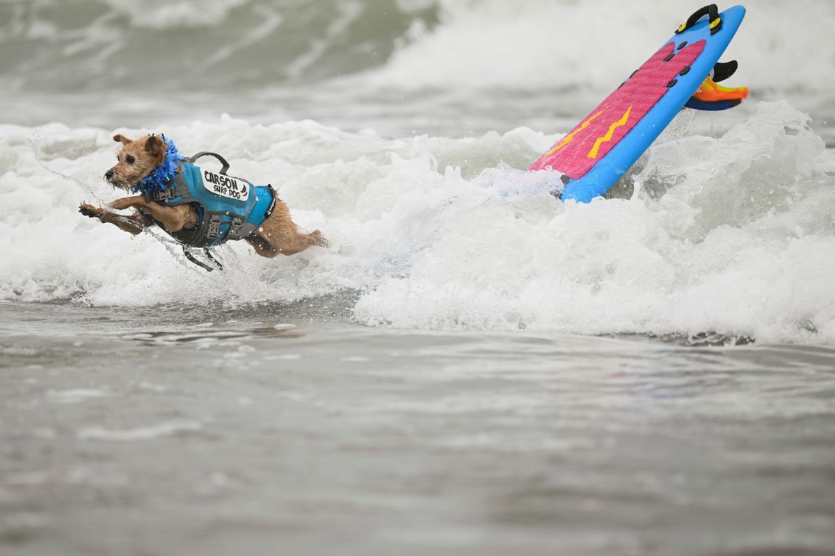 Labs, terriers and spaniels in monogrammed life vests dog-paddled out into the Pacific. Once out on the waves, their owners helped them hop on colorful boards and hang ten as the crowd cheered from the beach.