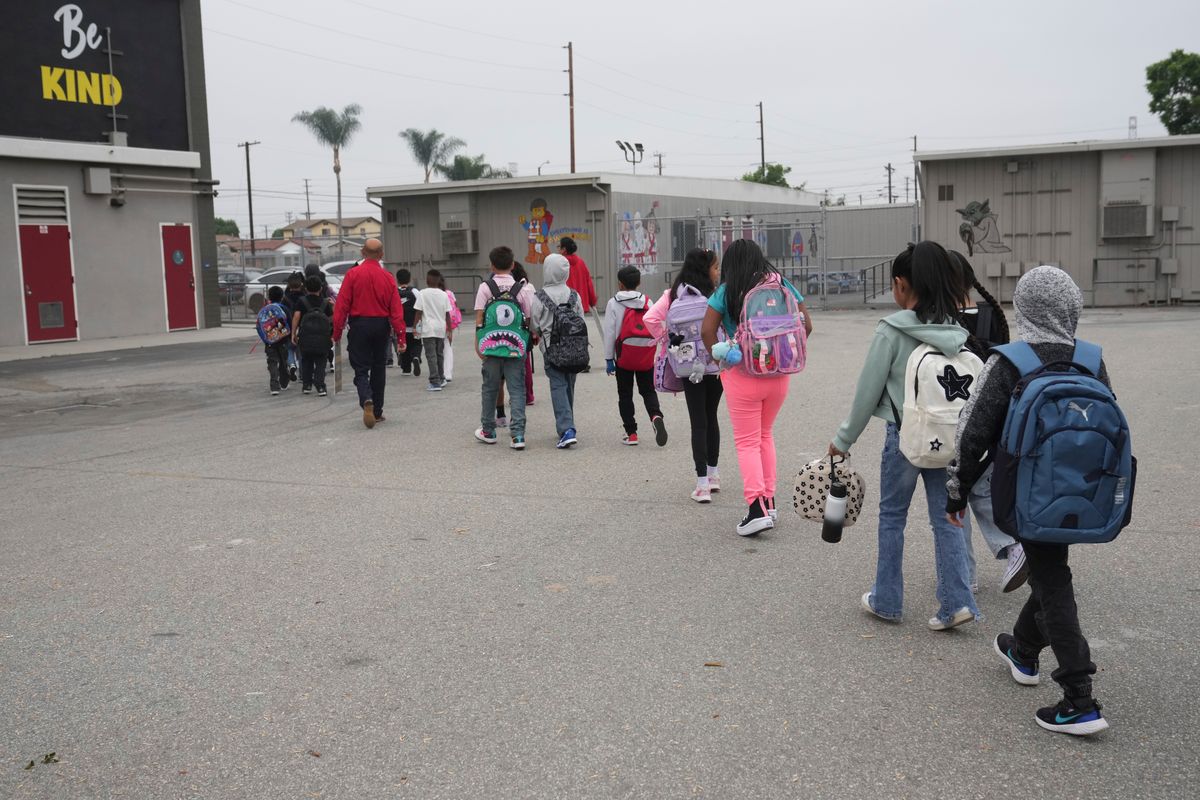 At 93rd Street Elementary School in southern Los Angeles, volunteers with activist group Union del Barrio patrolled the neighborhood in the early morning for any immigration activity, and staff wearing bright orange vests gave children — some walking alone — a warm welcome as they arrived.