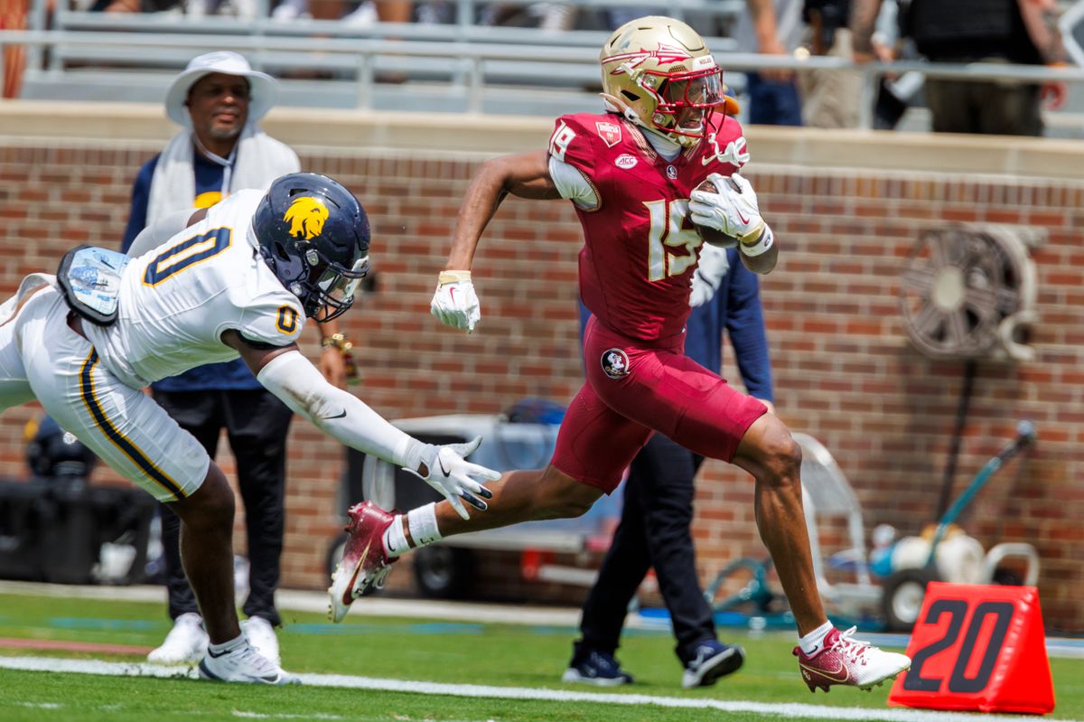 Robinson had four catches for 160 yards in the first 15 minutes, the most receiving yards by a Florida State player in a quarter in program history. The Southern Cal transfer finished with five catches for 173 yards and two scores, including an impressive one-handed snag.