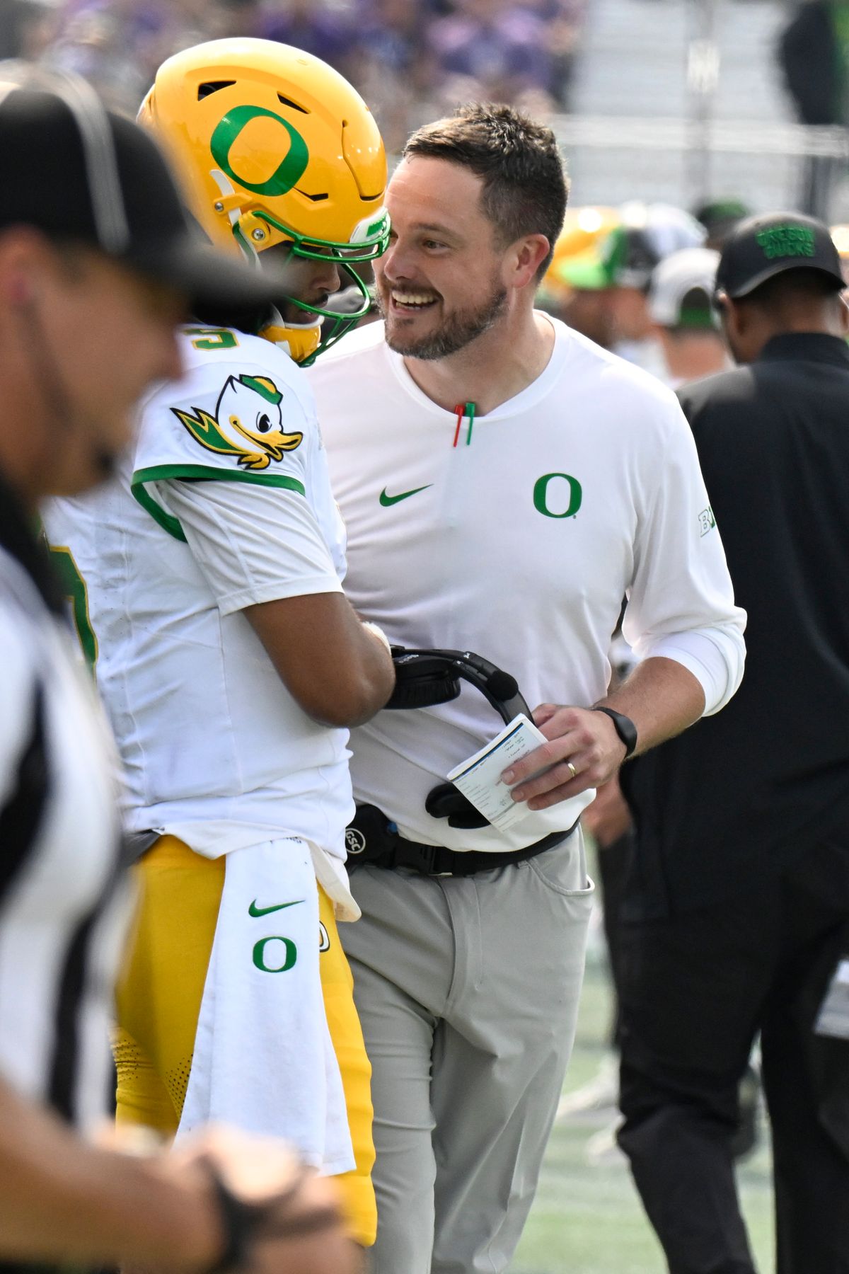Oregon took advantage of the game’s first turnover — Bryce Boettcher’s interception of a deflected pass in the first quarter — into the first touchdown a few plays later when Limar ran in from a yard After a field goal, Moore connected with Kenyon Sadiq for a 24-yard touchdown just before the half.