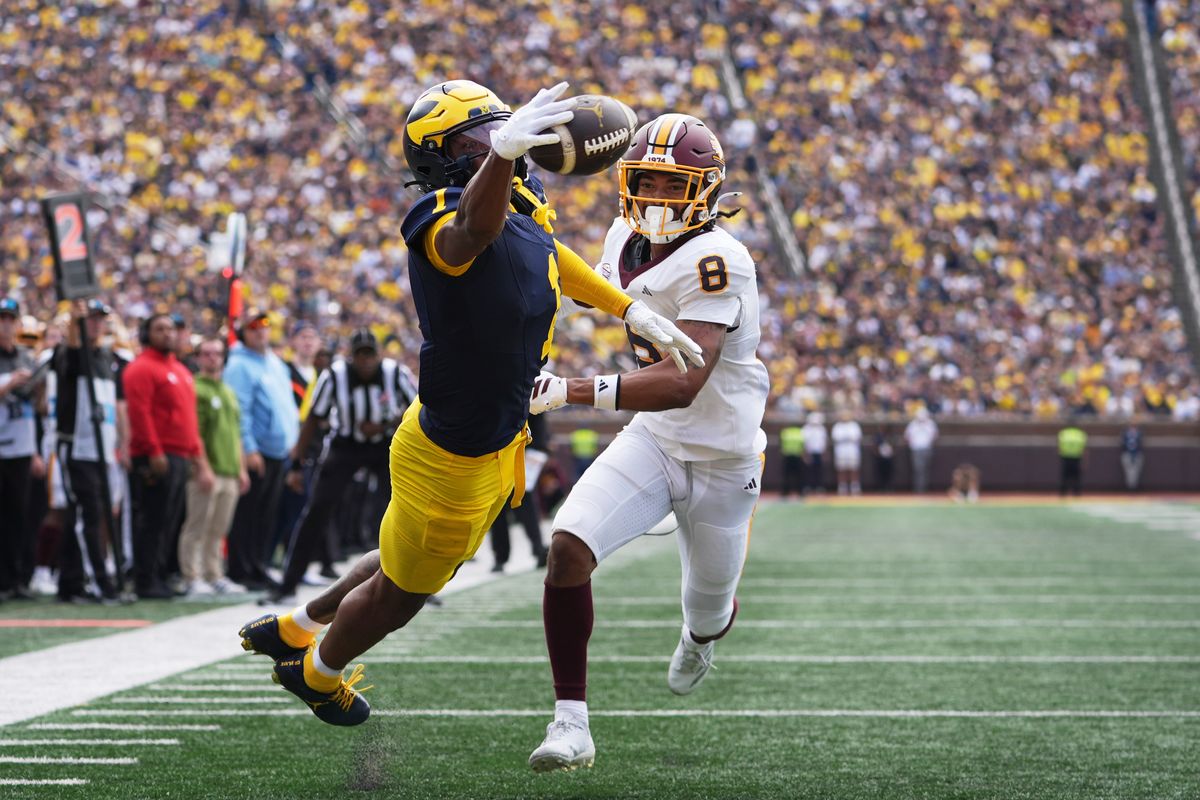Michigan’s Justice Haynes had 104 yards rushing and a touchdown on 14 carries. Jordan Marshall scored twice while running for 52 yards on 10 attempts.