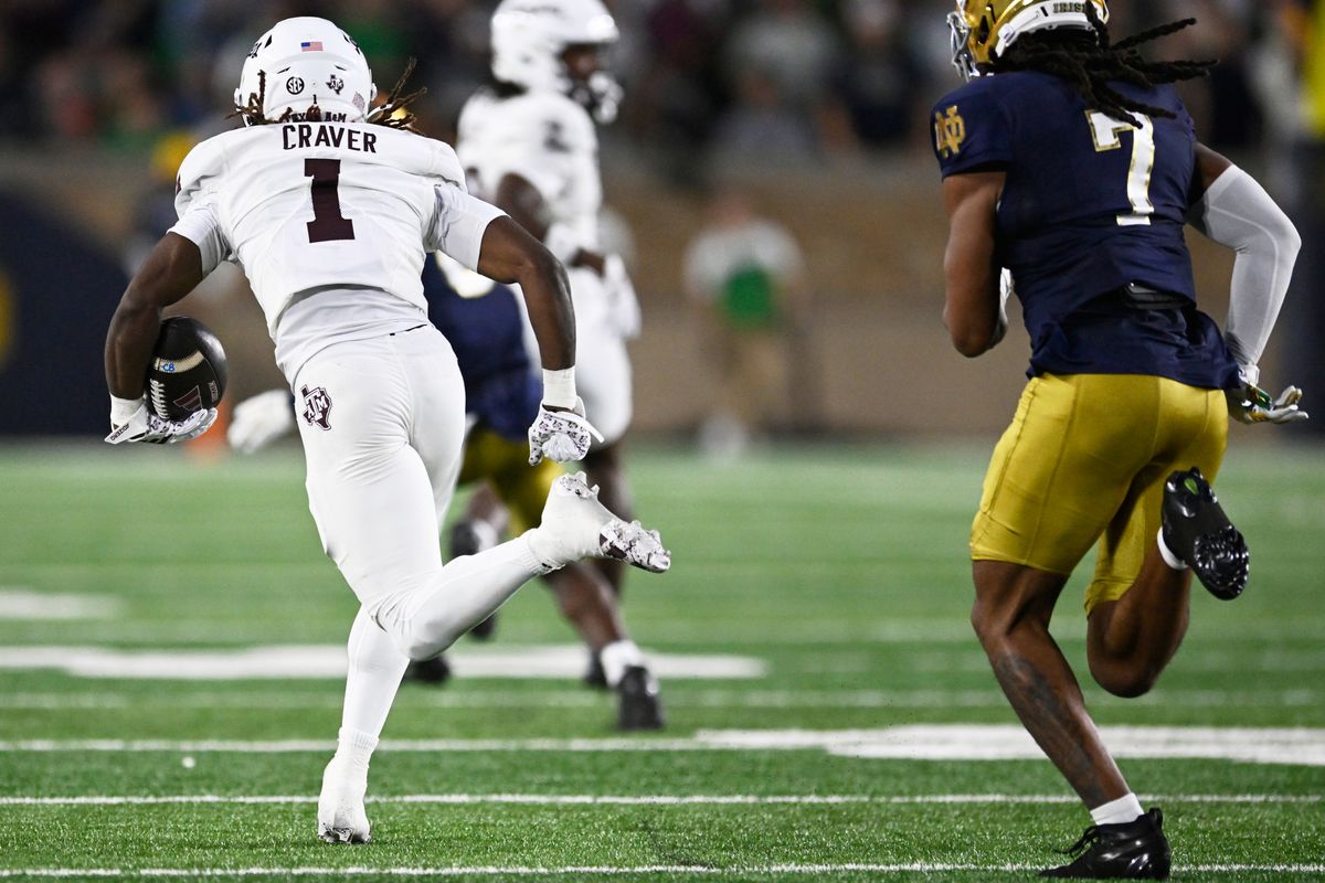 He scored the Aggies’ first points against Notre Dame when he got past his defender to make a catch at the A&M 30, broke through three would-be tacklers at the 50 and ran down the sideline to complete the 86-yard play.