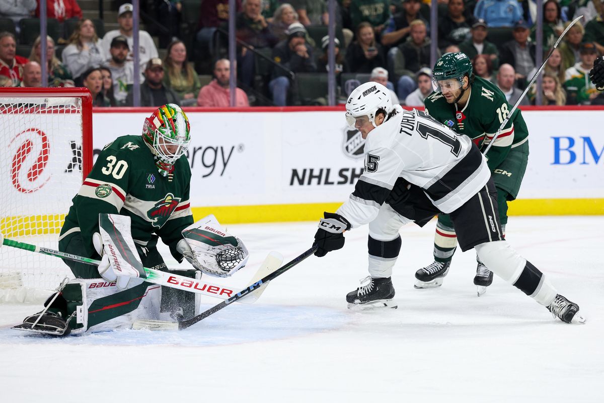 With a two-man advantage, Kaprizov scored from the slot just over two minutes later and Boldy skated in from below the right circle and his shot went off the glove of Kuemper at the post to make 3-0 at 16:33.