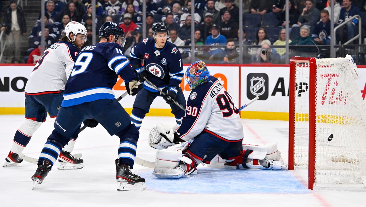 Elvis Merzlikins allowed five goals on 30 Jets shots, while Comrie made 20 saves for Winnipeg before the 13,847 fans gathered at Canada Life Centre.