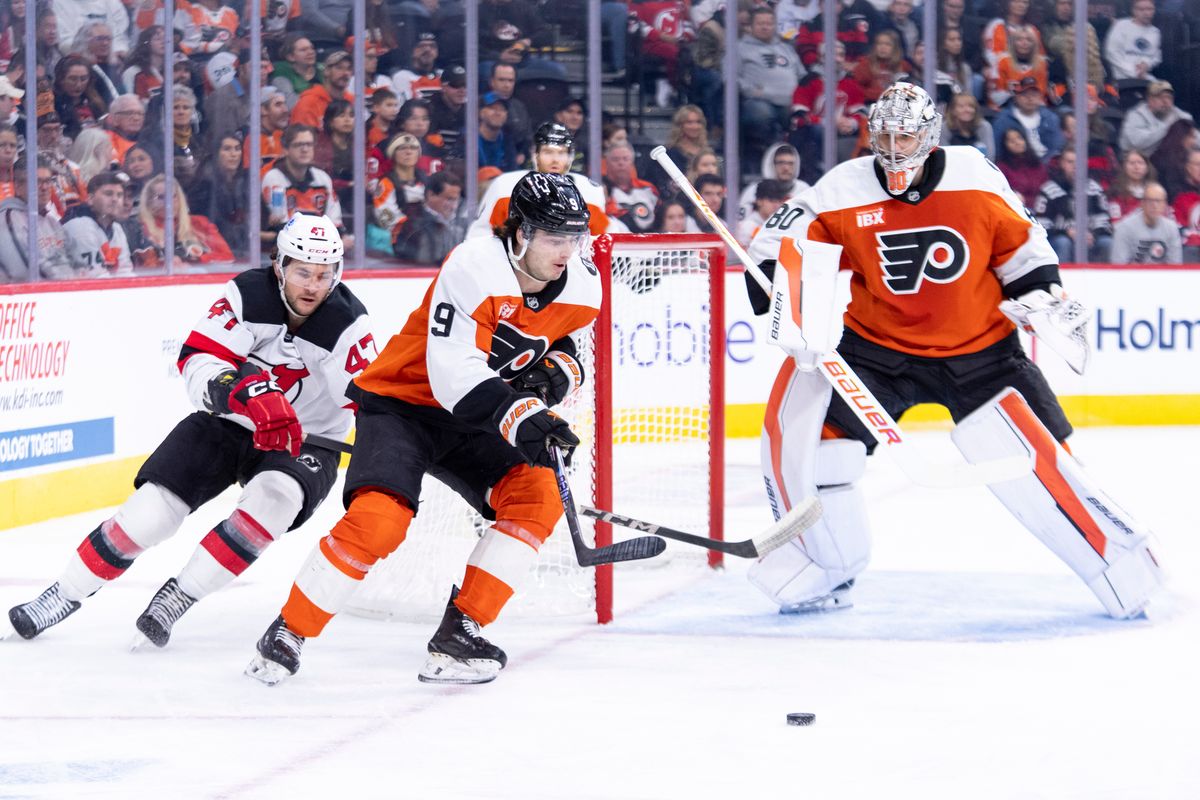 The Flyers and Devils were tied at 1 in the first when the scoring barrage started.
