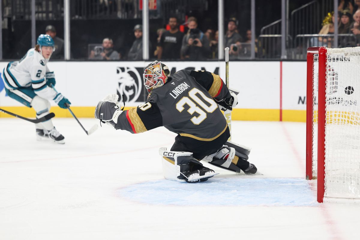 Hertl scores twice, Lindbom gets his 1st NHL win in the Knights’ 4-3 victory over the Sharks