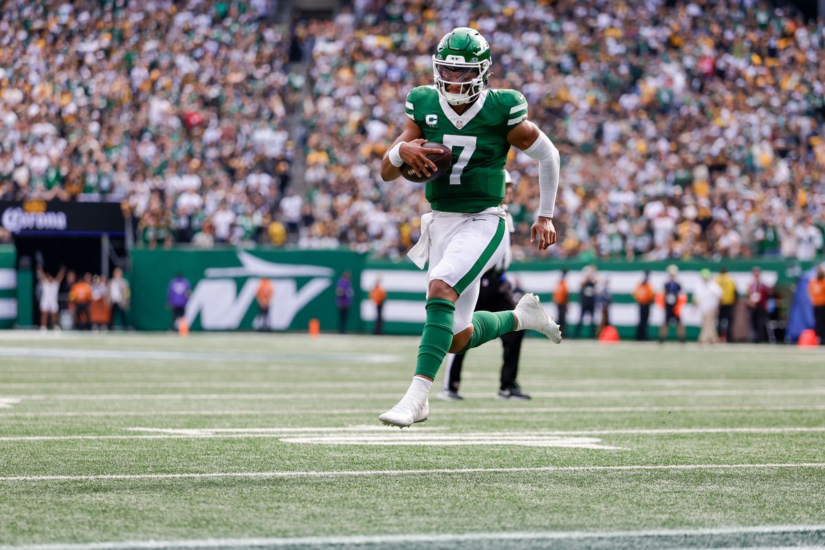 Fields, also playing against his former team, ran for his second touchdown of the game to put the Jets ahead 32-31 with 7:01 remaining when he faked a handoff to Breece Hall, who had 107 yards on 19 carries, rolled to his right and high-stepped his way into the end zone for a 1-yard score.