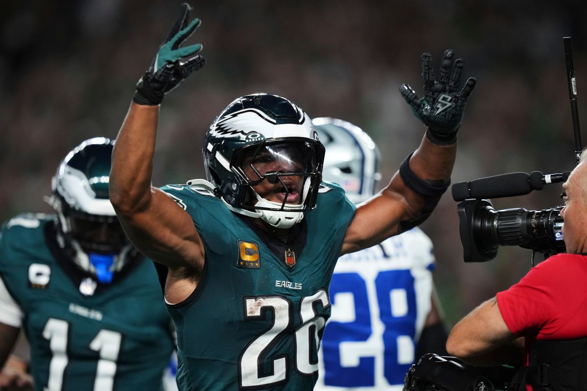 Behind two touchdown runs from Super Bowl MVP Jalen Hurts, the Super Bowl champion Eagles led 24-20 with 4:44 left in the third quarter when the game was delayed. Play was stopped for just more than an hour before the game resumed at 11:30 p.m.