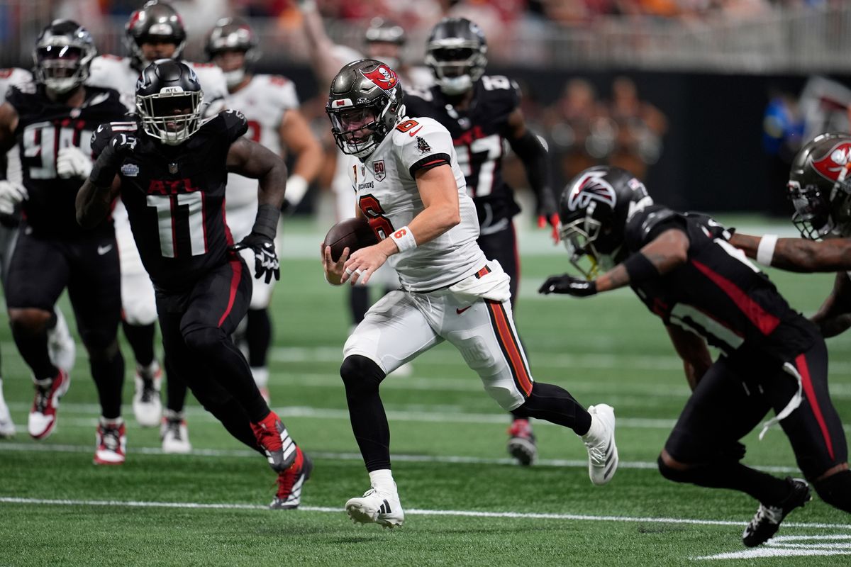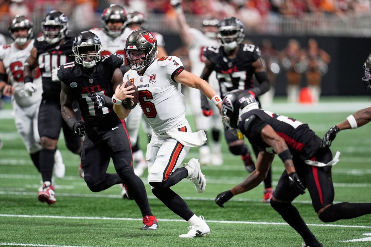 Bijan Robinson was stopped on a fourth-and-1 run at the Tampa Bay 47, setting up the Buccaneers for Mayfield’s 30-yard touchdown pass to Egbuka.
