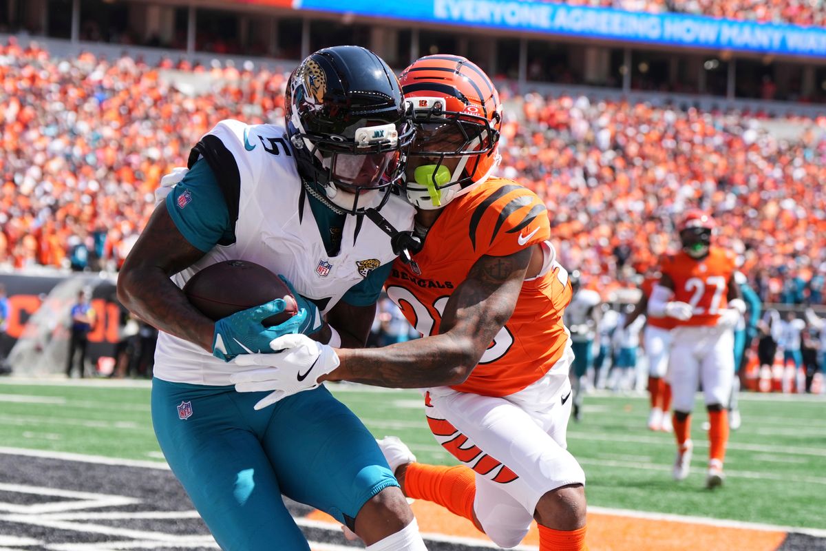 Browning’s best throw was a 42-yard touchdown to Tee Higgins in the fourth quarter that made it 24-24. On third-and-5, Higgins got separation from Tyson Campbell and caught the ball at the Jacksonville 16. Campbell and teammate Andrew Wingard ran into each other at the 11, allowing Higgins to waltz into the end zone.