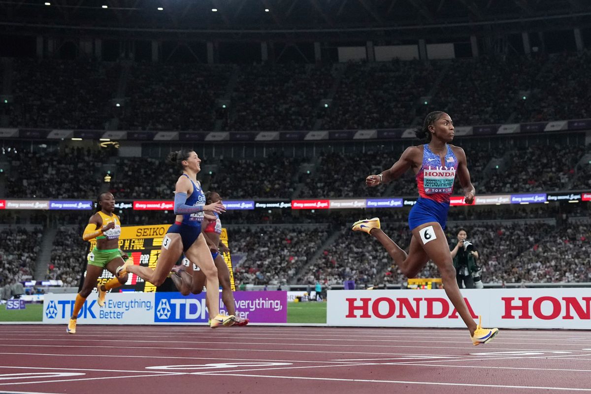 Minutes after he won, Melissa Jefferson-Wooden completed the first women’s 100-200 double at the worlds since Shelly-Ann Fraser-Pryce in 2013, winning in 21.68 seconds. It was a .46-second margin over surprise silver medalist Amy Hunt of Britain. It also made Jefferson-Wooden the first American to complete the double at the world championships.