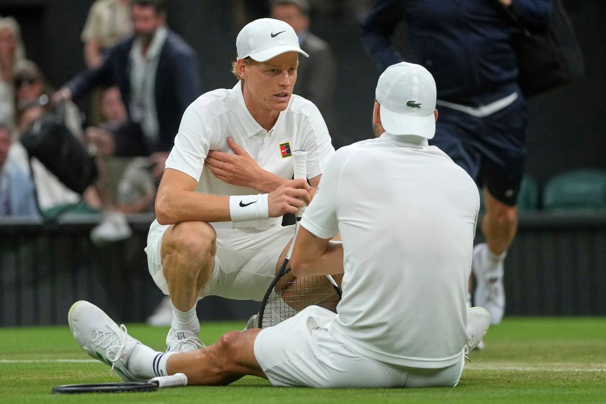 No. 10 Ben Shelton improved to 3-0 against Lorenzo Sonego at majors this year by beating him 3-6, 6-1, 7-6 (1), 7-5. Shelton’s first Wimbledon quarterfinal will come against No. 1 Jannik Sinner, who moved on despite a painful right elbow and a two-set deficit when No. 19 Grigor Dimitrov quit because of an injured chest muscle.