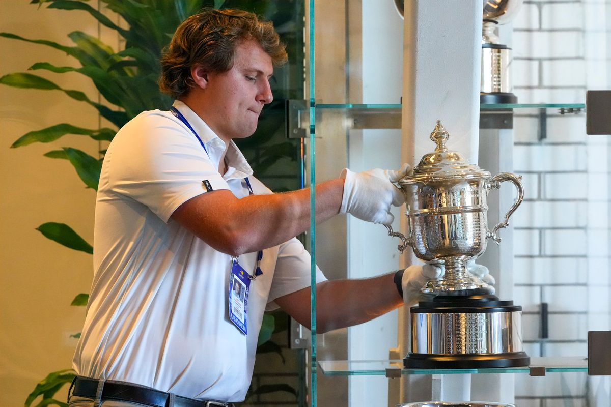 That one, like the original men’s, is displayed during the tournament in a locked glass box near where players enter the event’s main arena and will be briefly handed to, then taken away from, whoever wins the women’s final in Arthur Ashe Stadium this Saturday.