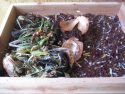 It is important to have the bin set up before bringing your worms home. There are many suitable bedding materials, ranging from shredded corrugated cardboard to composted rabbit or horse manure, depending upon your vermicomposting system. My system uses coir mixed with either shredded newspaper or office paper. (No, there is no longer a problem with colored paper or ink.) Mix the two together with water, it should feel like a wet sponge that has been wrung out – wet, but not too wet.