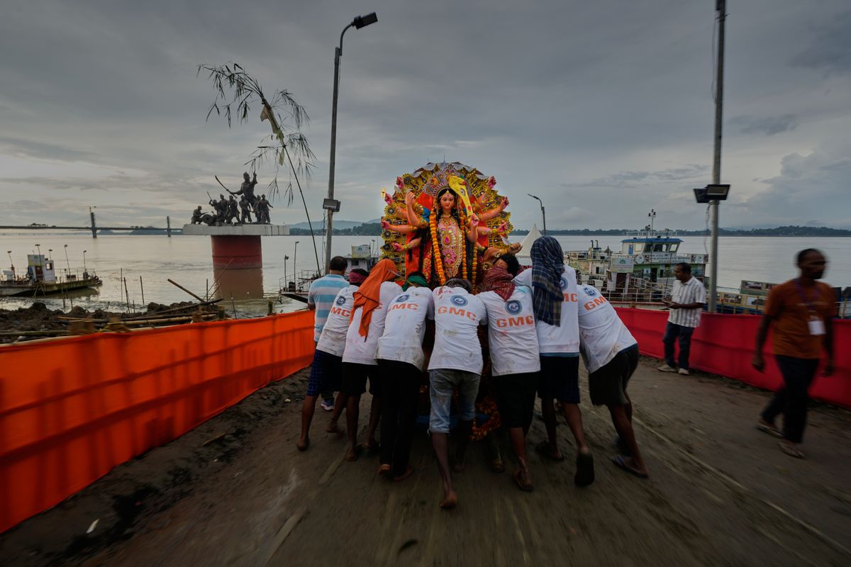 Across eastern India, Bangladesh and parts of Myanmar, the festival ended with vibrant processions — music pounding, drums rolling, crowds chanting — carrying statues of the goddess Durga to rivers and ponds. There, amid song and splashing water, her clay form is immersed, dissolving into the currents. The ritual is both a farewell and a renewal, a riot of sound and color.
