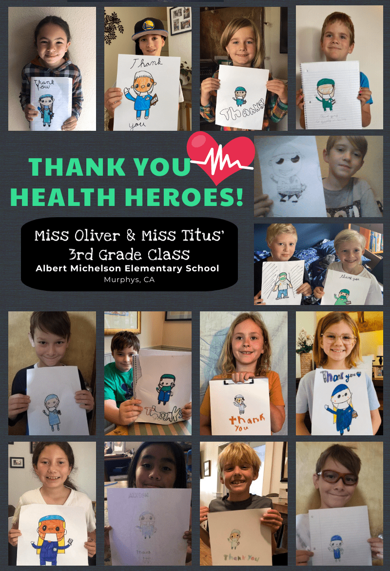 “During our brainstorm, the kids asked if we could send their thank you notes and drawings to the local [media] so they could really get the word out. So, here we are, sending you this collage of their artwork and a collection of their thank you notes. Normally, we would not self promote something we were doing in the classroom, but this felt so heartwarming and beautiful, it feels worth sharing.”