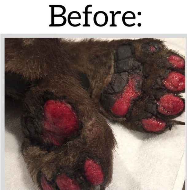 Once at the wildlife center, a veterinarian wrapped the bear’s burned paws and gave him painkillers. It was decided to let the wounds heal to a certain point and then a skin graft treatment would be done to speed the healing process.