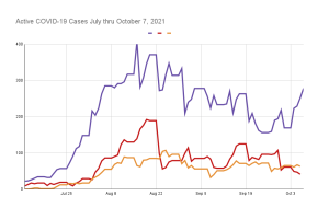 Of the 31 new community cases, 20 were unvaccinated and 11 were vaccinated. Of Tuolumne’s population eligible to be vaccinated 59% have been vaccinated. Tuolumne County’s active community cases went below 200 for 8 days before increasing. Cases were above 200 for 49 days between August 2nd and September 19th with a high of 407 active cases. During the previous surge, active cases were above 200 for 36 days between November 15th and December 20th with a high of 350. Active cases were below 30 between March 5th and July 14th. There were two Covid deaths reported on Monday, October 4th.