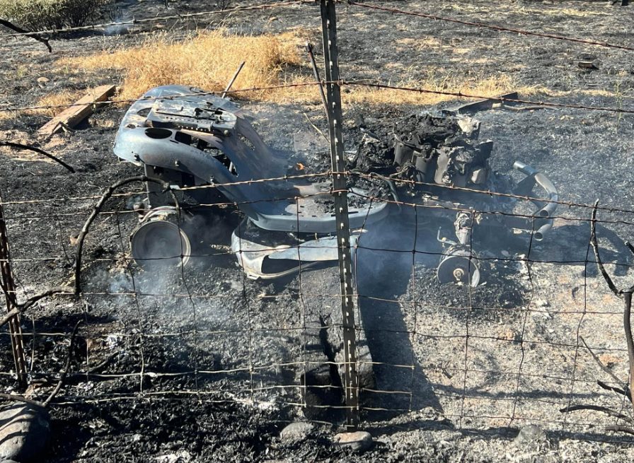 The Calaveras Consolidated Fire Department reports that it was started by a riding lawnmower. The mower, along with a small shed, were both destroyed by the fire.