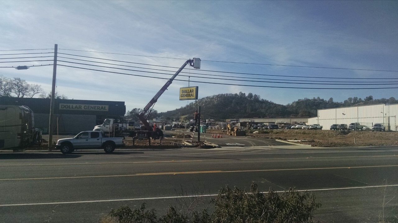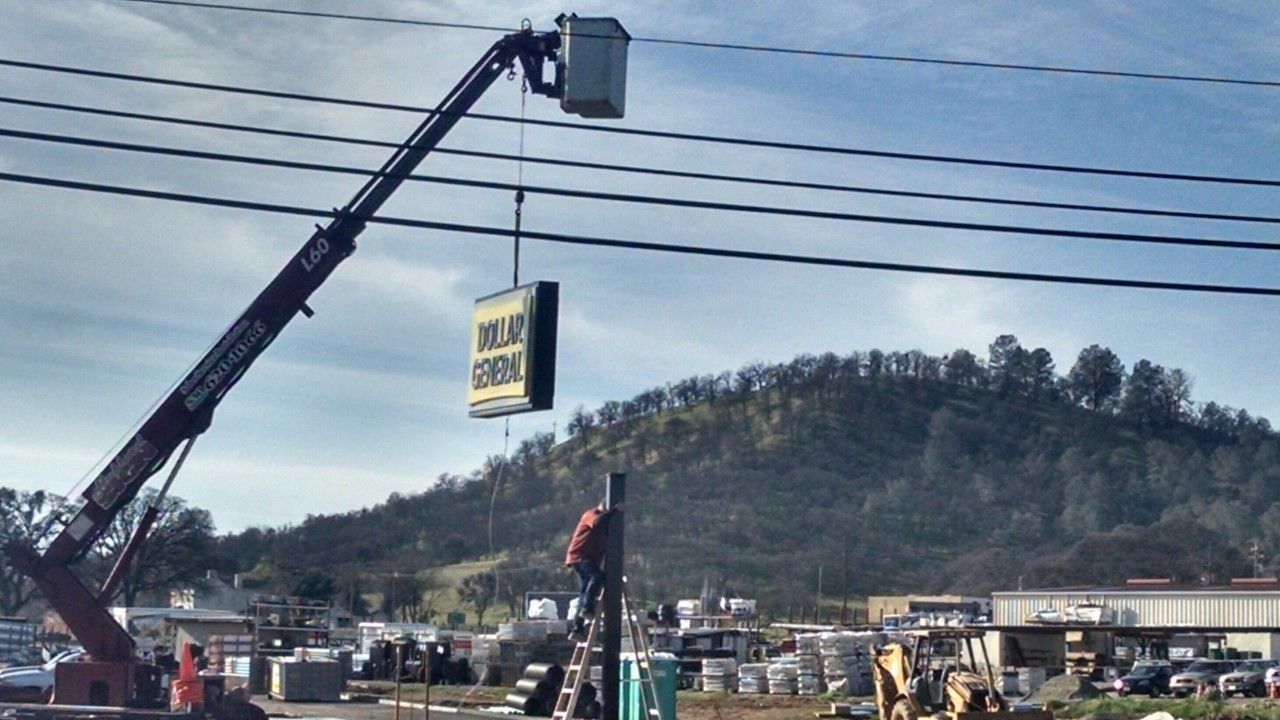 Valley Springs, CA — A crane lifted the Dollar General sign onto a pole Friday at the site where construction is underway in Valley Springs as seen in pictures in the upper left-hand image box.