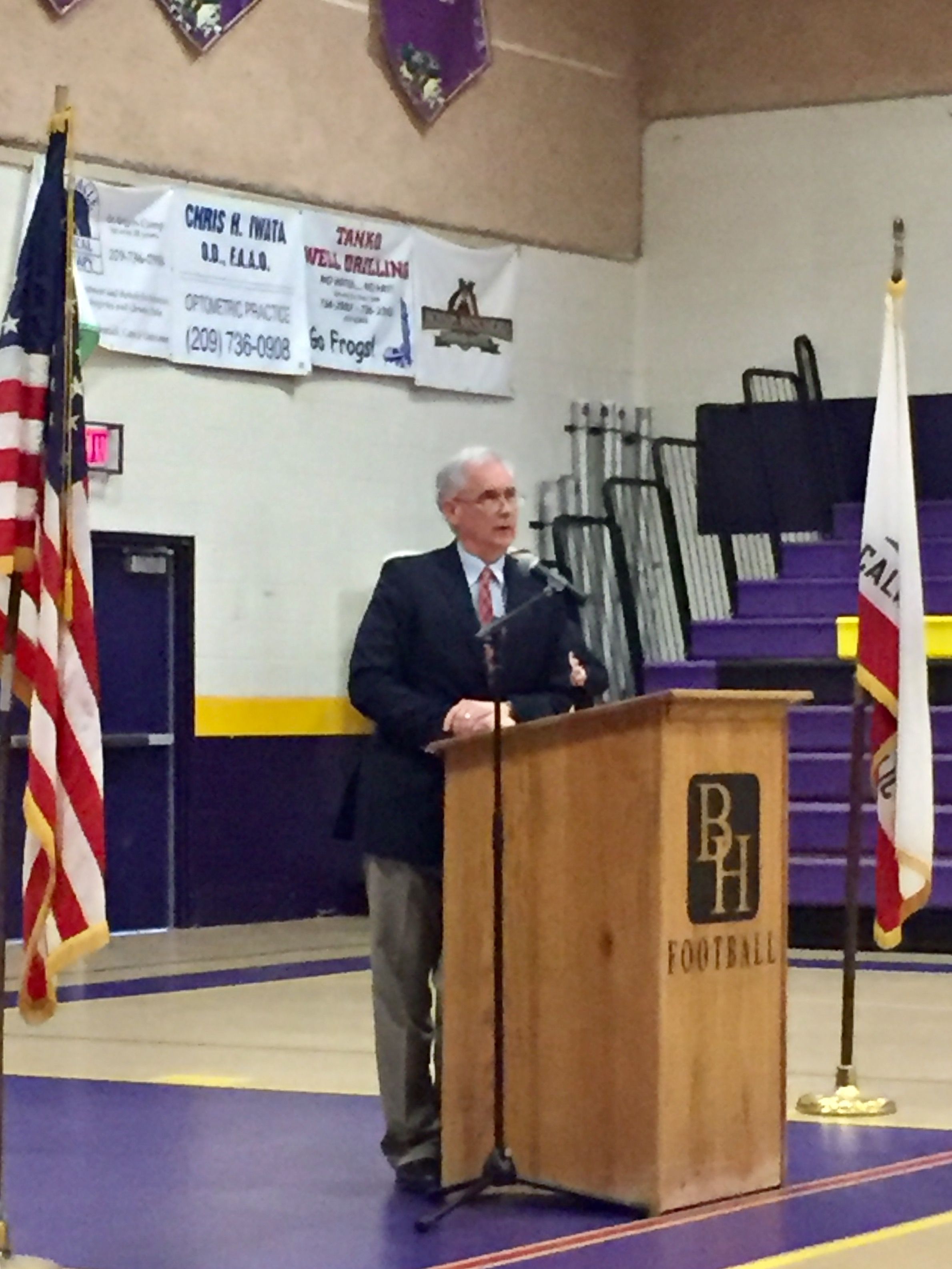 The public event kicked off promptly at 6 p.m. inside Angels Camp’s Bret Harte High School gymnasium just after the the U.S. Representative for California’s 4th congressional district briskly strode in; flanked by aides and well supported by a strategic scattering of local law enforcement officials. A whirl of about four dozen sign waving protestors, some bearing supportive Obamacare and anti-Trump resistance posters, followed on his heels and made some brief noise, as shown in this video clip. McClintock, game face intact, acknowledged their First Amendment right and the need for civility. “As long as we are talking with each other and not shouting each other or disrupting…we can’t do this if people are seeking to disrupt these proceedings,” he cajoled, indicating before he opened the floor that he had about an hour and a half for taking questions.