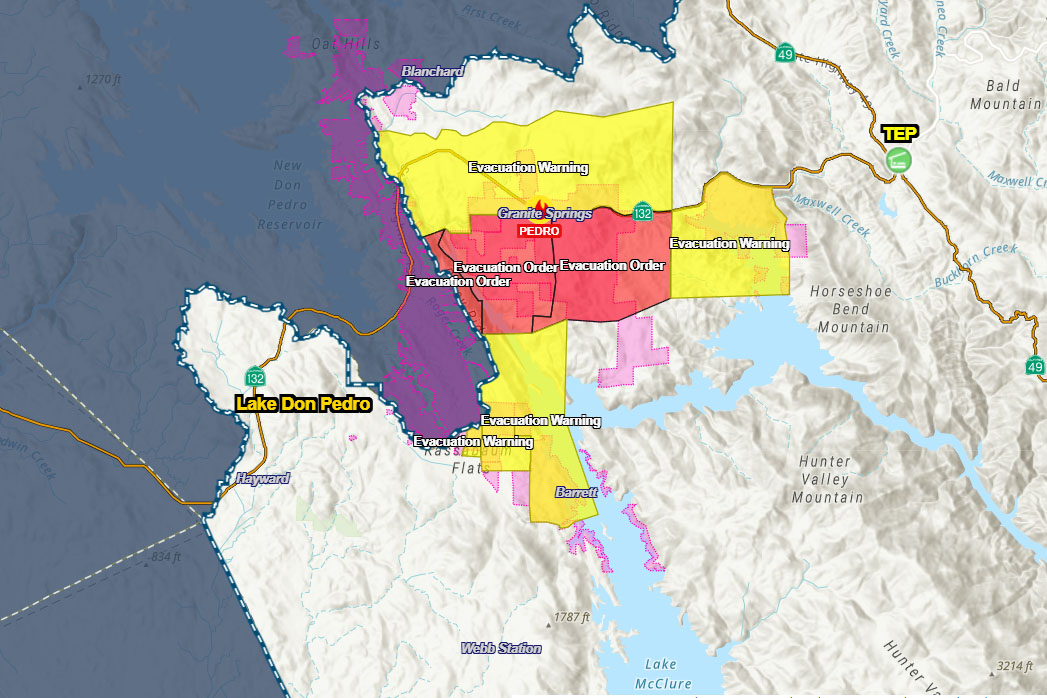 Update at 2:40 p.m.: Mariposa County Sheriff’s Office is reporting evacuation warnings for the Pedro Fire burning along Piney Creek Road south of Highway 132 in the Granite Springs area of Mariposa County. The warnings are for the north side of Hwy. 132 from Merced Falls Road to Jones Road and the south side of Hwy. 132 from Jones Road to Horseshoe Bend, including the Horseshoe Bend Recreation Area. Currently, there is no designated evacuation center.
