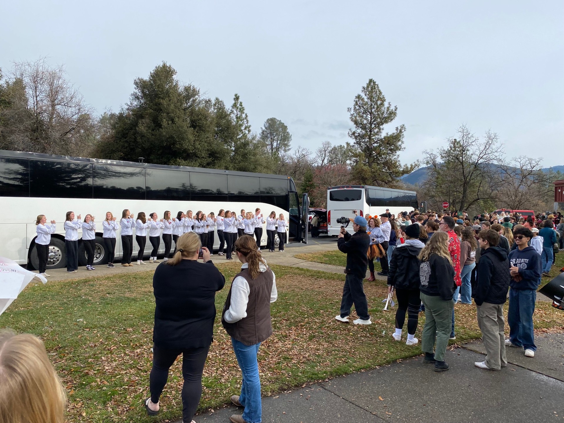 In downtown Sonora, as the pictures in the image box show, people lined North Washington Street to wave and give the thumbs up to the Wildcat players in the passing buses. In Tuolumne, students and community members gave the team a musical send-off, with the school band and cheerleaders, all cheering the players on as they loaded up the buses to head to the 6A Championship in Fullerton. Their game is tomorrow (Saturday, Dec. 14) at 3 p.m. The team will take on Monte Vista High School out of San Diego County. The game will air live on 93.5 KKBN.