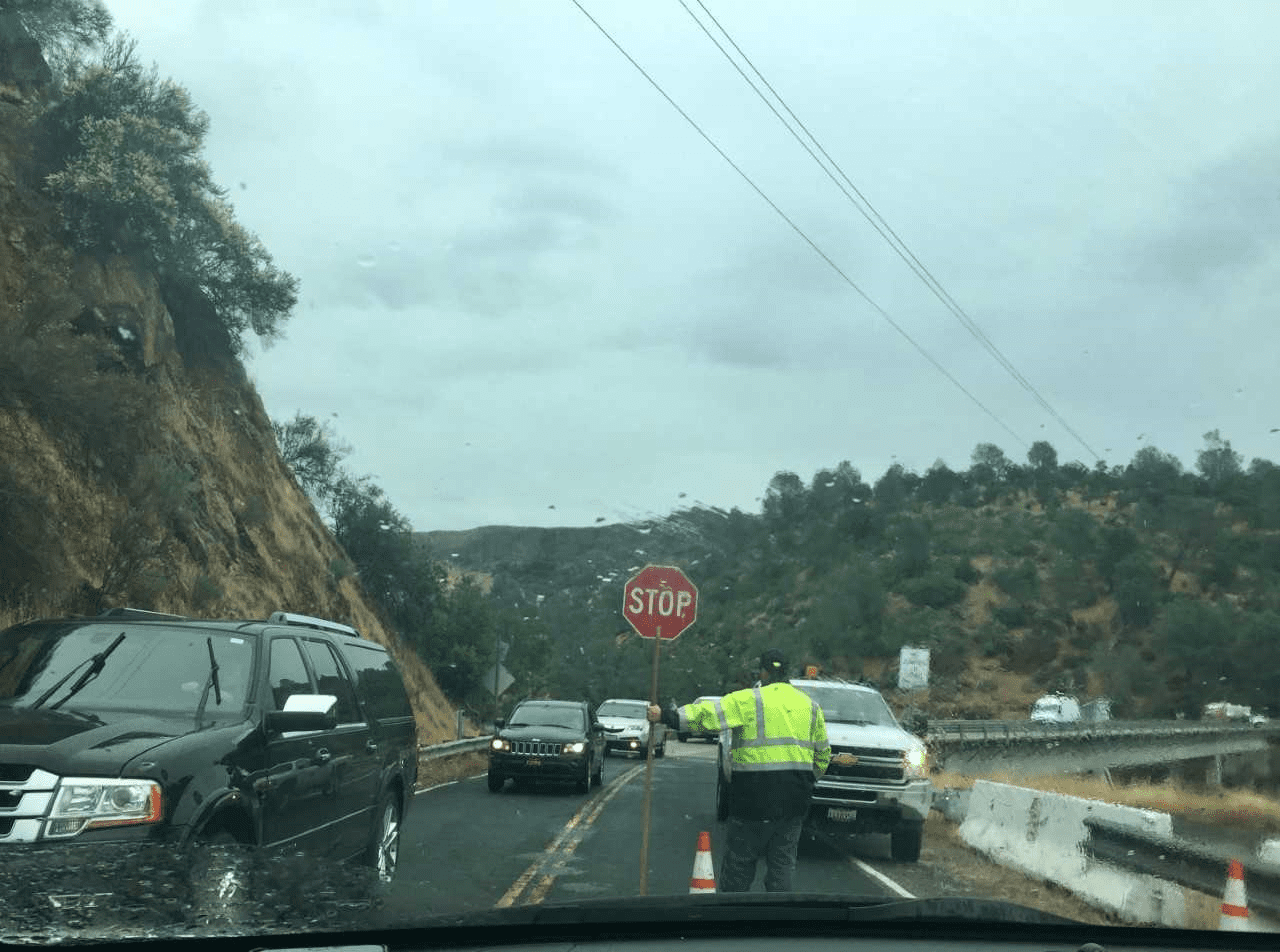 The actual cone zone is on the Tuolumne County side of the bridge just above the corkscrew turn. There are flaggers stationed just before that along with a pilot truck. Another flagger is working traffic control on the Calaveras County side just before the bridge.