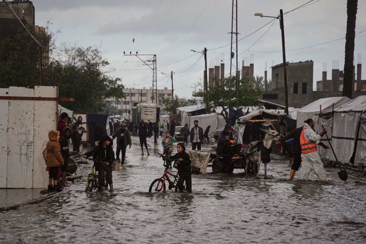 Roadways in Deir al-Balah turned into shallow rivers of murky water. One man waded across carrying a young daughter in each arm.