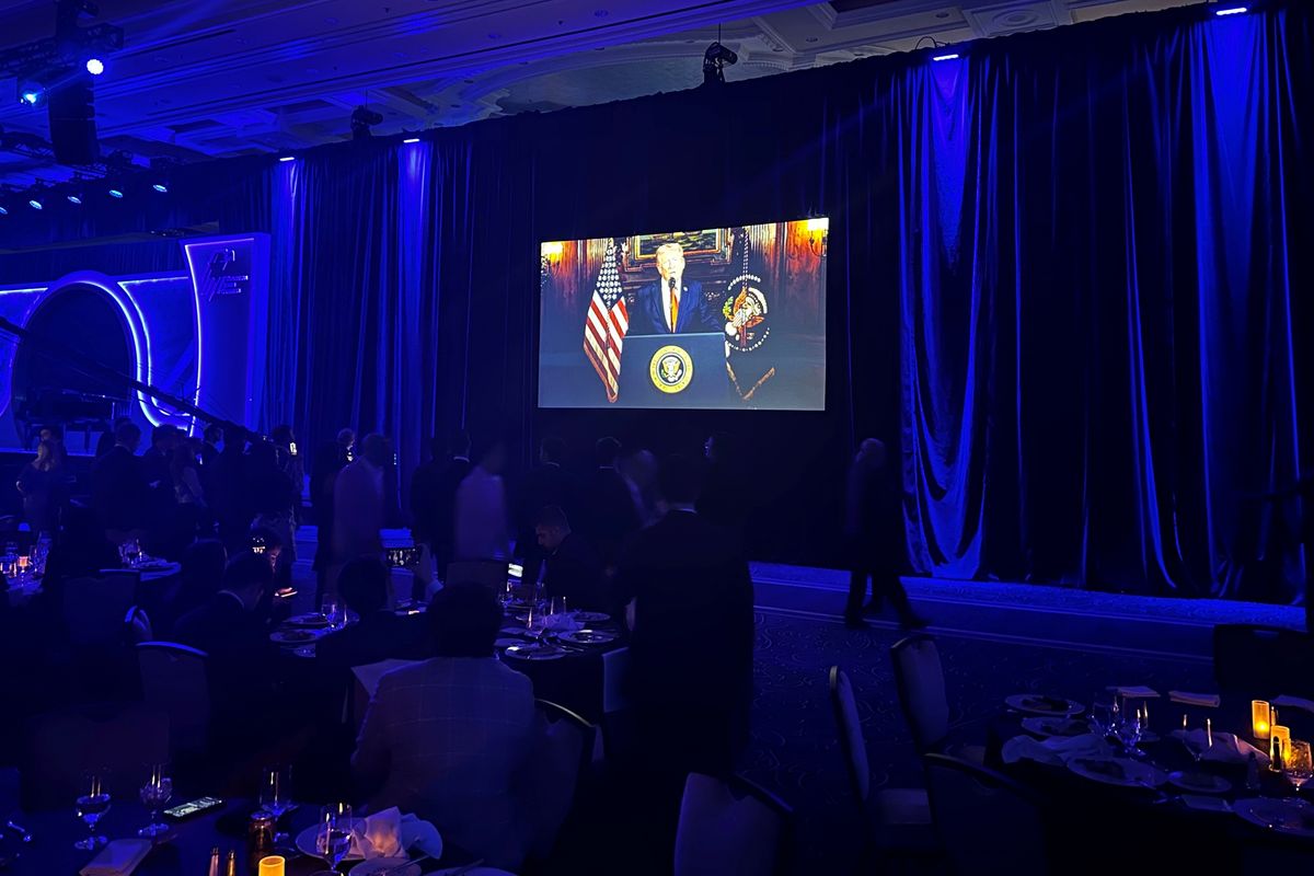 When an image of Trump was cast on screens in the ballroom, the audience rose in cheers to hear his recorded 5-minute address to the group, in which he declared, “No one has been a greater friend to Israel than Donald J. Trump.”