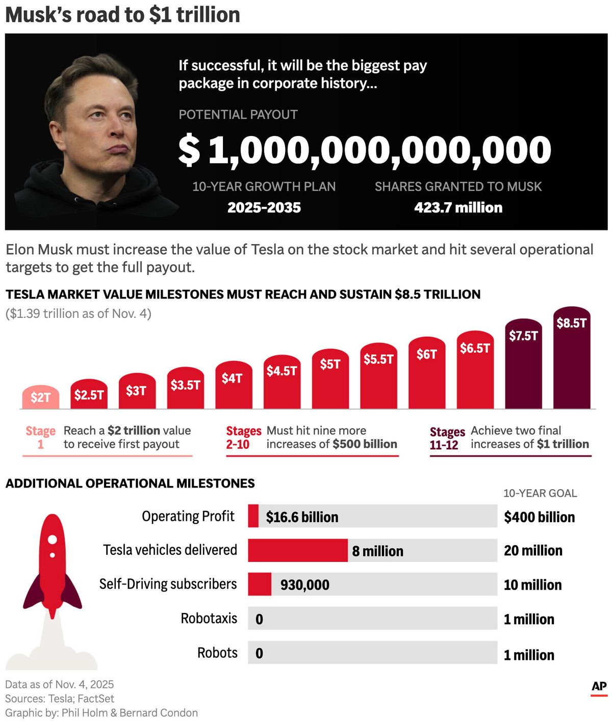 To get the full pay, for instance, he has to deliver to the car market 20 million Teslas over 10 years, more than double the number he has churned out over the past dozen years. He also has to massively increase the market value of the company and its operating profits and deliver one million robots, from zero today.