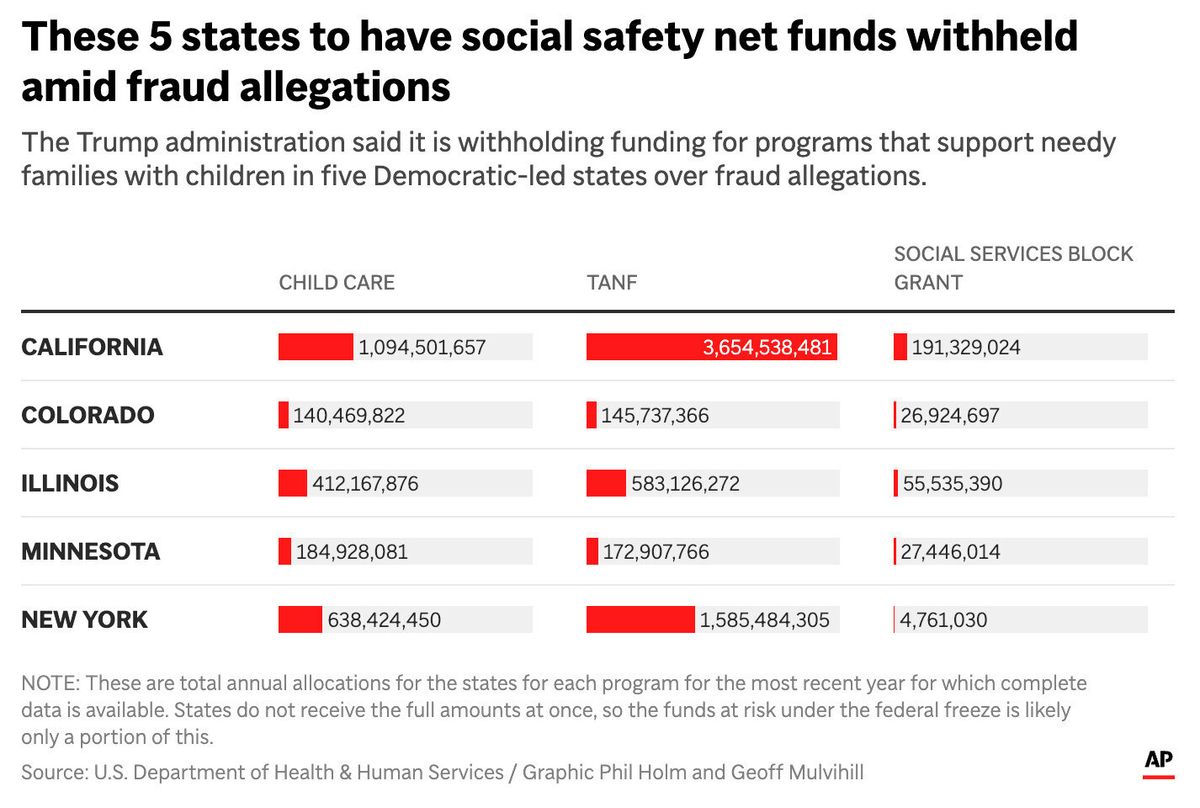 The U.S. Department of Health and Human Services said it was pausing the funding because it had “reason to believe” the states were granting benefits to people in the country illegally, though it did not provide evidence or explain why it was targeting those states and not others.