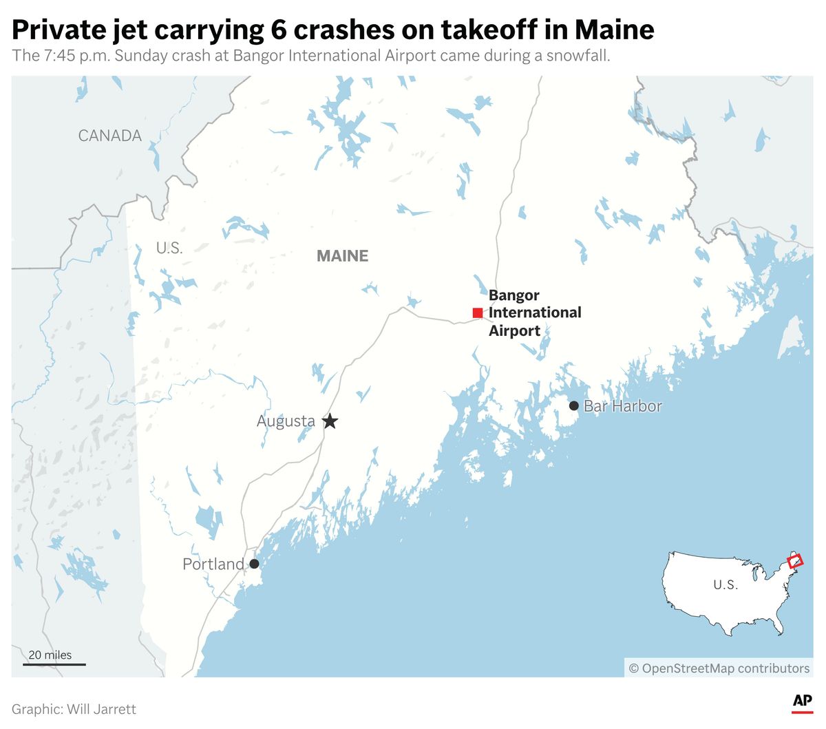 PORTLAND, Maine (AP) — As snow from a massive storm began to fall in Bangor, Maine, on Sunday night, six people who had stopped to refuel a Paris-bound luxury jet prepared for takeoff. None would survive the crash that followed, the cause of which remains unknown.